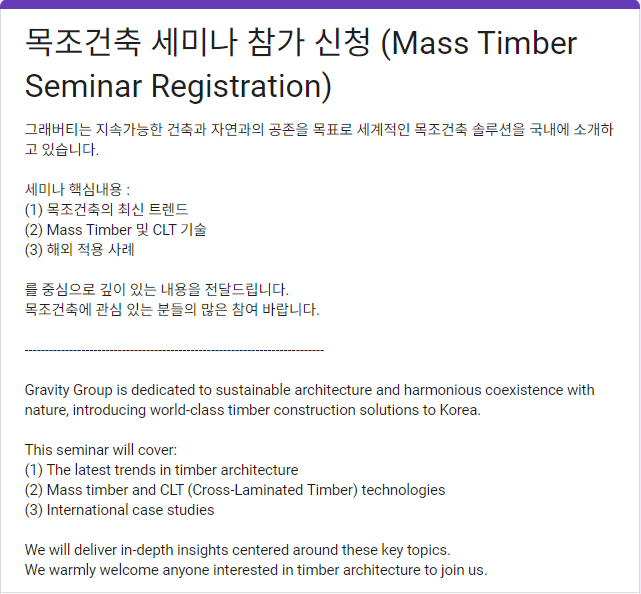 그래버티 목조건축 세미나 참가 신청 안내│Mass Timber Seminar Registration