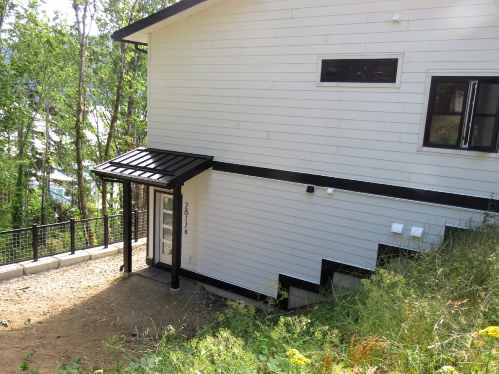 The 2035 square foot, two story house is laid out so that the upper floor is the main living space, with a garage and a single suite that can operate as a guest house below. By including the guest suite below, the home owners can either use it for guests and family members, or they can rent it out to greatly reduce their monthly cost of living. Its inclusion will also likely increase its value in the real estate market if they were to sell the home some time in the future.