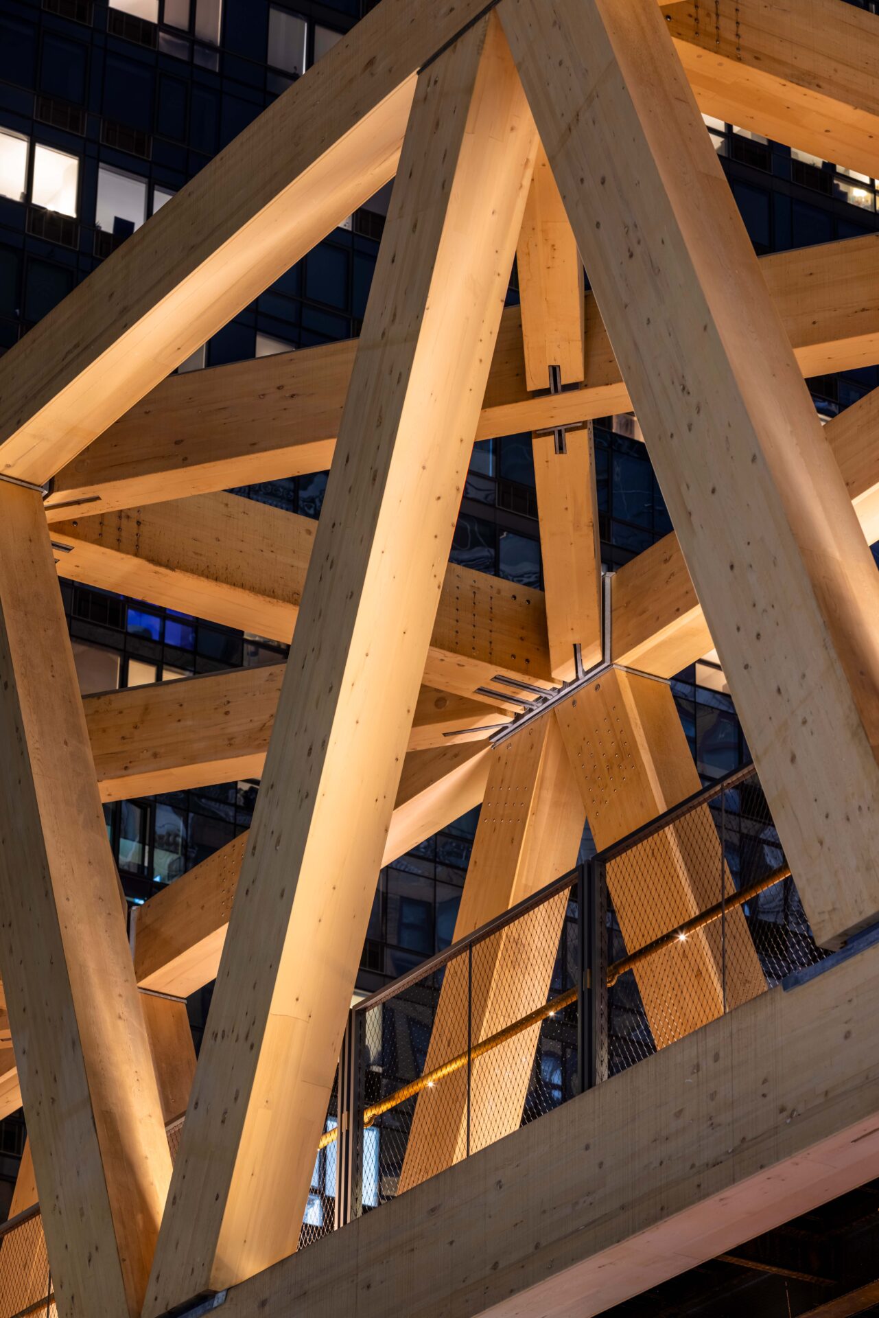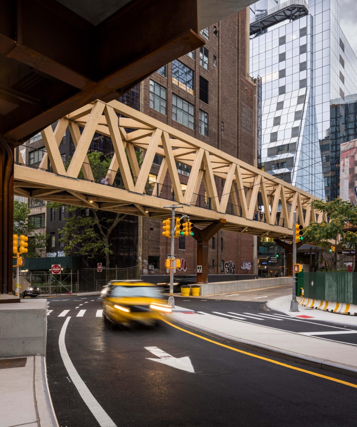 The High Line Timber Bridge is one of two pedestrian bridges that make up the Moynihan Connector and is designed to seamlessly connect public open spaces to transit within the greater bustling urban landscape of Midtown West in New York City.