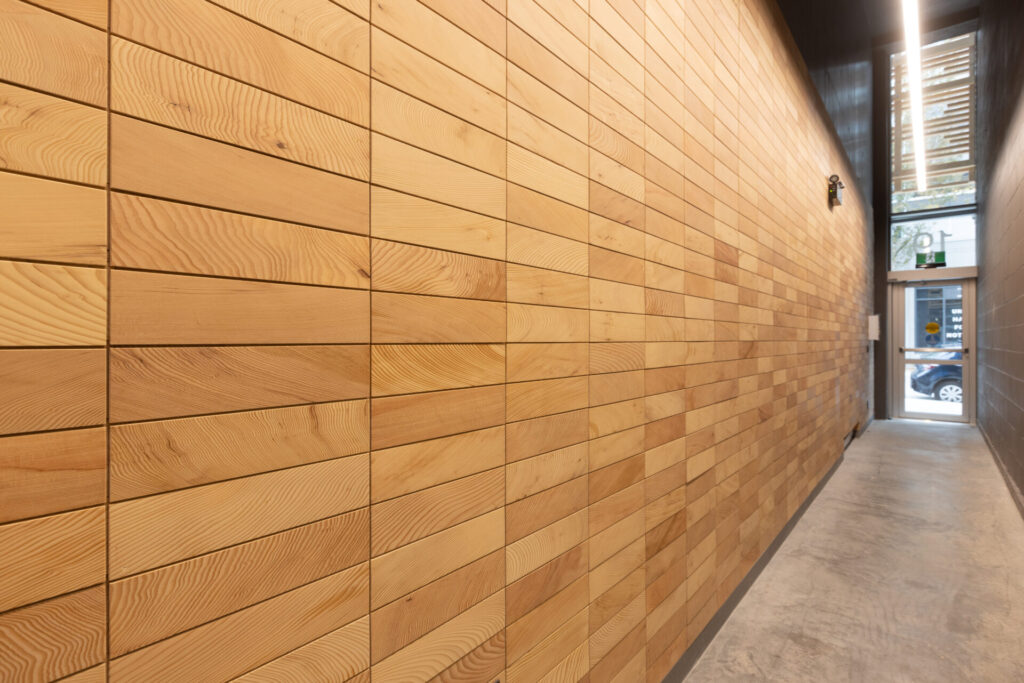5-ply and 7-ply cross-laminated timber (CLT) wall, floor, and roof panels serve as the building’s primary structural system, complemented by a concrete and masonry base. Manufactured at Mercer Mass Timber’s factory, a total of 32 master panels equating to roughly 15,360-square-feet arrived by trucks from Washington state. The use of advanced logistical software allowed for just-in-time delivery, making for precise installation on this tight urban site.